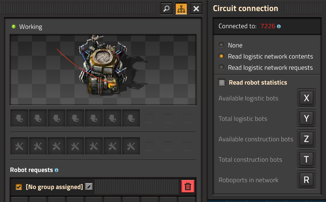We need to configure the Roboport to Read logistic network contents . This is so that all the items in the logistics network that this Roboport belongs to are made available to the circuit network.