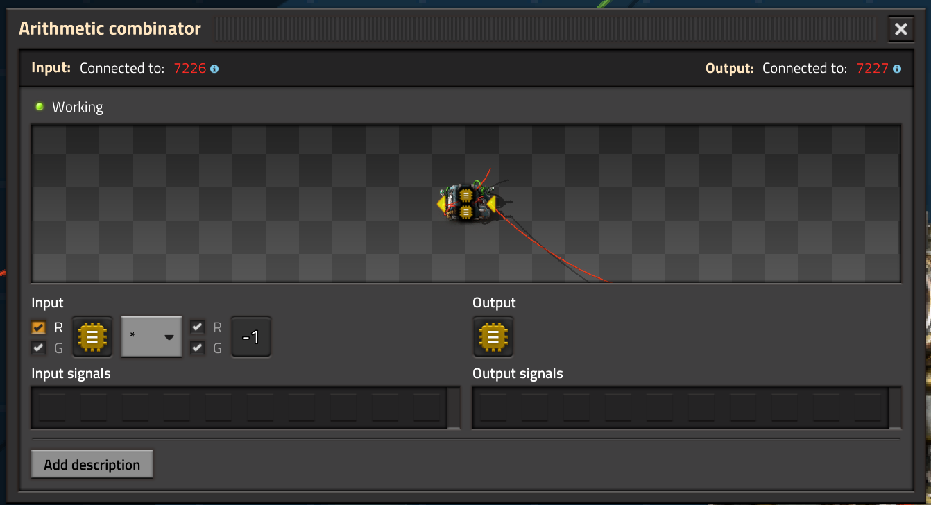 Now we configure an Arithmetic combinator to multiply everything from the input by -1 so we get a negative number and output it. Configure INPUT: EACH * -1 / OUTPUT: EACH.