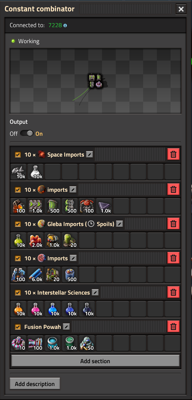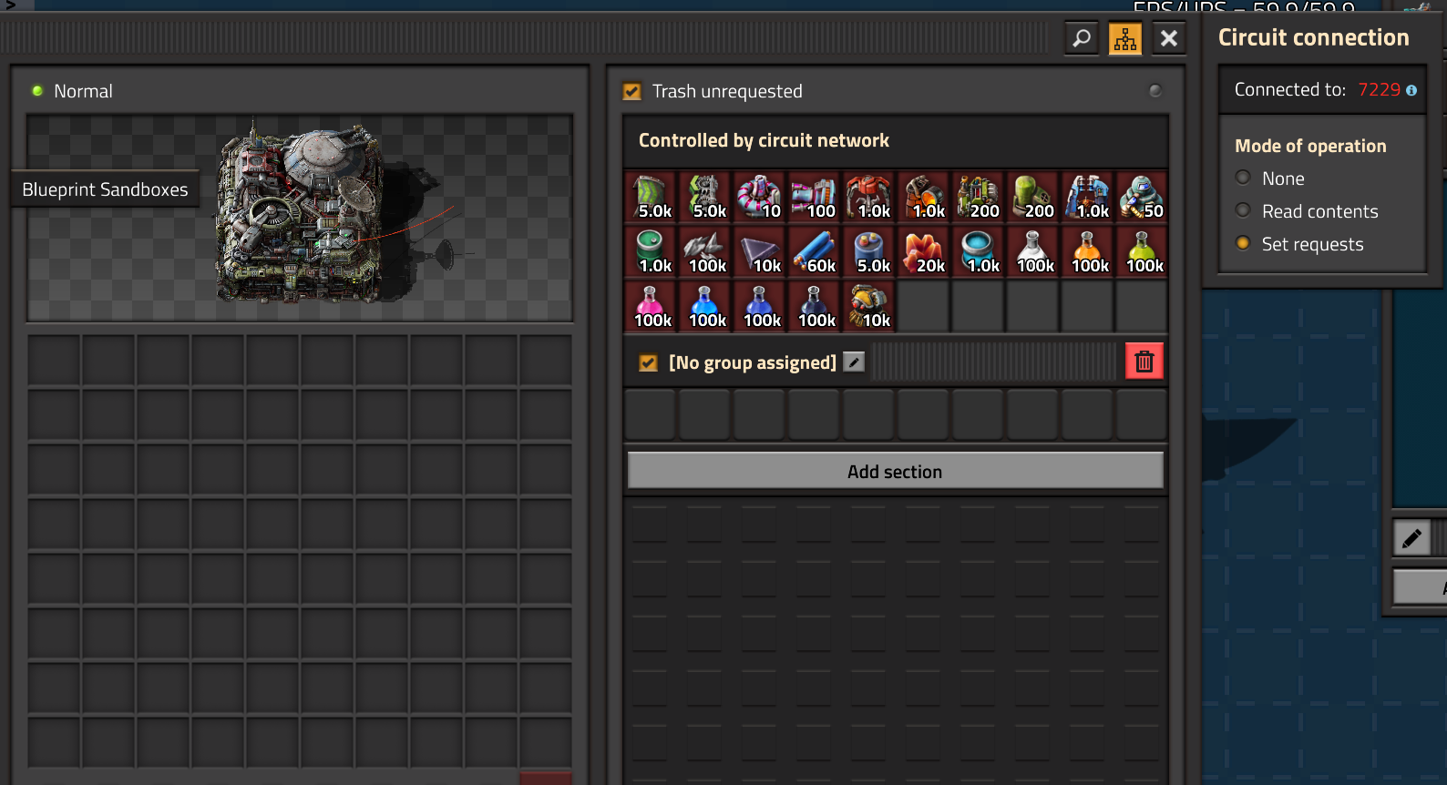 The constant combinator makes liberal use of logistics groups. These are such a great feature. Particularly if you're able to utilize 5x GROUP to make sure you have a nice buffer of certain items in one place without having to keep separate groups for different use cases.