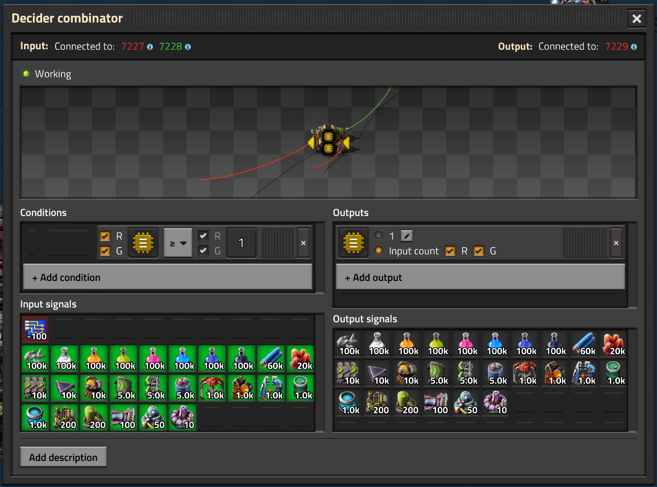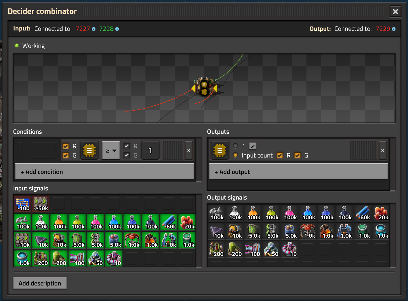 Now, we need to configure the Decider combinator to compare the Red inputs to the Green inputs and output the delta to send to space.